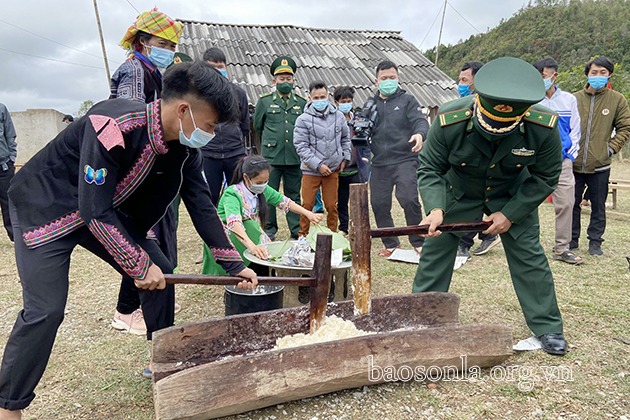 Chương trình “Xuân biên phòng ấm lòng dân bản” gồm các hoạt động trao tặng cờ Tổ quốc và ảnh chân dung Chủ tịch Hồ Chí Minh cho bản Sam Quảng; tuyên truyền Luật Biên phòng cho người dân; tặng 53 suất quà Tết cho 43 hộ có hoàn cảnh khó khăn và 10 gia đình văn hoá; tặng 20 chăn ấm cho hội viên phụ nữ nghèo; tặng 30 kg gạo cho Ban quản lý bản và người có uy tín của bản Sam Quảng, với tổng trị giá 45 triệu đồng; trao 2 suất học bổng (mỗi suất 1,5 triệu đồng) cho học sinh nghèo học giỏi. Phối hợp Hội Liên hiệp Phụ nữ xã Mường Lèo tổ chức gói bánh chưng; tổ chức cắt tóc miễn phí “Tay kéo Biên phòng” và thi giã bánh dày, ném Pao, đánh Tu lu...