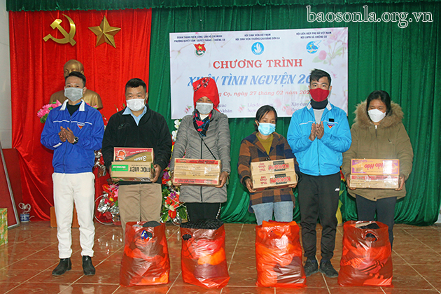 Đoàn tình nguyện tặng quà cho các hộ nghèo xã Chiềng Cọ, thành phố Sơn La.