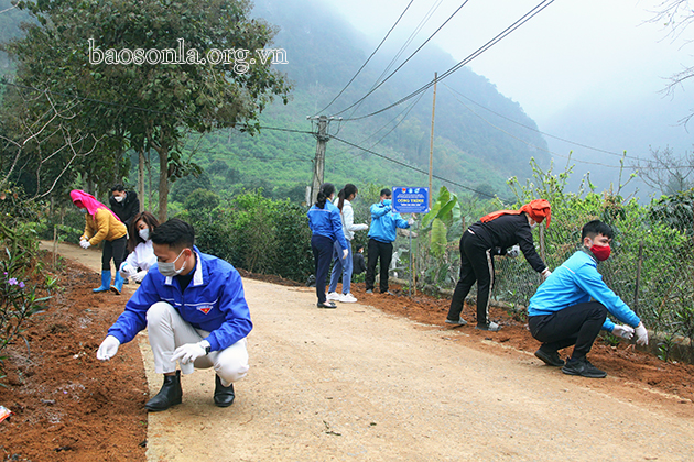 Đoàn tình nguyện làm tuyến đường hoa tại bản Bôm Huốt, xã Chiềng Cọ.
