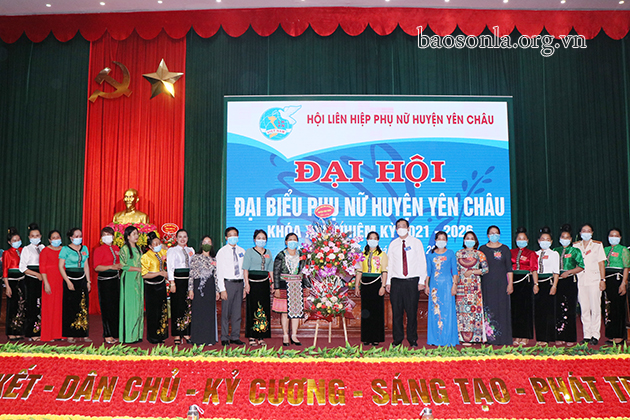 Lãnh đạo Hội LHPN tỉnh và huyện Yên Châu tặng hoa chúc mừng Ban Chấp hành Hội LHPN huyện Yên Châu khóa XXI
