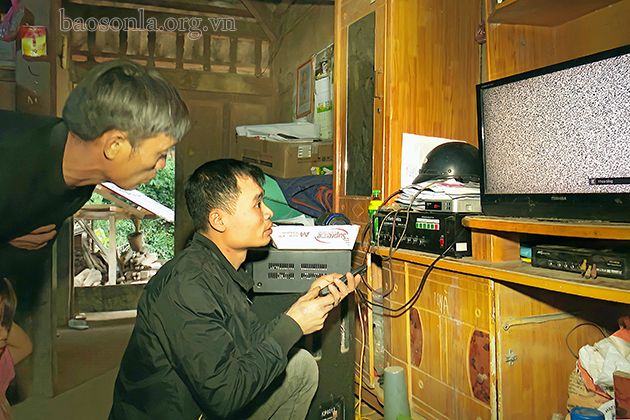 Người dân bản Sa Lai, xã Tân Xuân, huyện Vân Hồ lắp đặt tivi sau khi có điện lưới quốc gia.