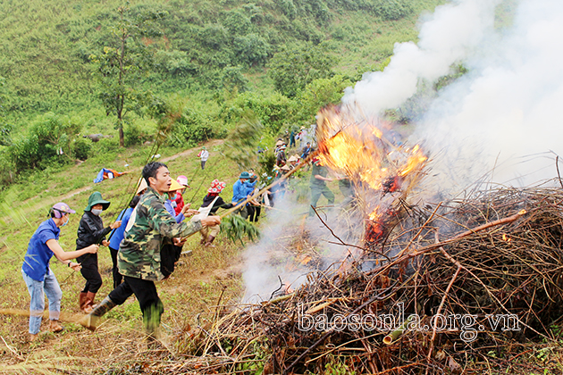 Các lực lượng tham gia phòng, cháy chữa cháy rừng tại bản Giôn, xã Mường Giôn (Quỳnh Nhai).