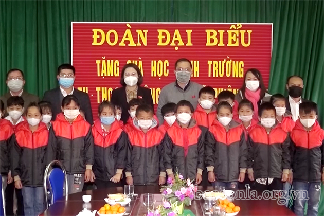 Đoàn đại biểu Quốc hội tỉnh tặng áo rét cho học sinh Trường tiểu học và THCS xã Phiêng Côn.