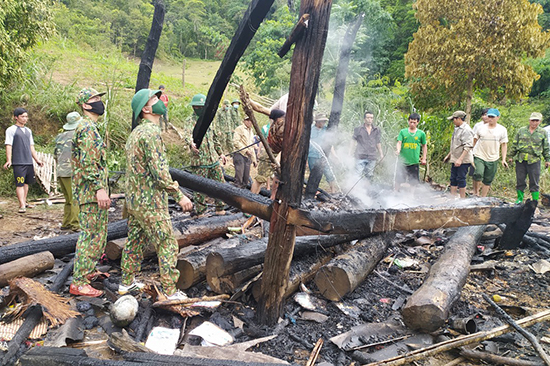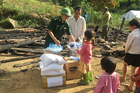 Cán bộ, chiến sỹ Đồn Biên phòng Chiềng On giúp đỡ gia đình anh Vì Văn Lá dọn hiện trường vụ cháy.