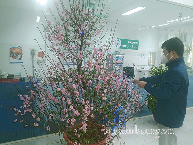 Trang trí cành đào trong Khu Cách ly điều trị bệnh nhân Covid-19.