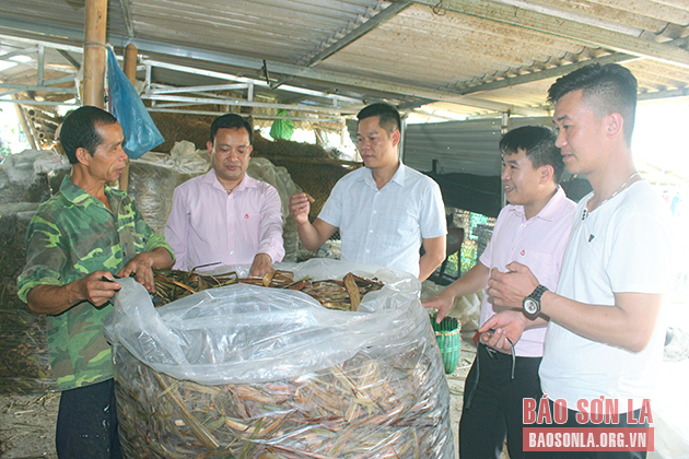 Cán bộ Ngân hàng CSXH Chi nhánh tỉnh kiểm tra việc sử dụng vốn vay tại xã Chiềng Mai, huyện Mai Sơn.