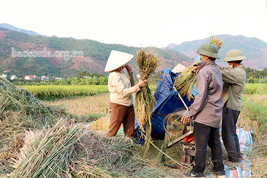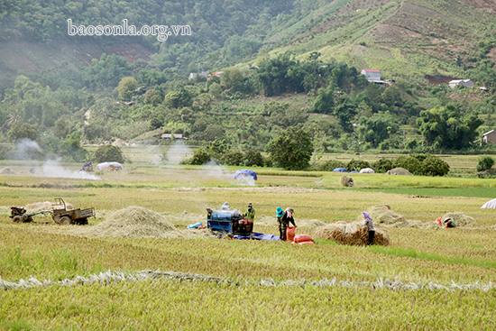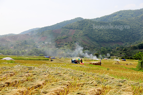 Hai bên quốc lộ 4G qua địa phận các xã Chiềng Cang, Chiềng Khoong, Mường Hung, Nà Nghịu vào huyện Sông Mã, nơi nào có máy tuốt lúa là nơi đấy rộn rã tiếng nói cười của bà con. Người chờ thu thóc mới, người chờ đến lượt thuê máy tuốt lúa, không khí náo nức, rộn rã cả một vùng.