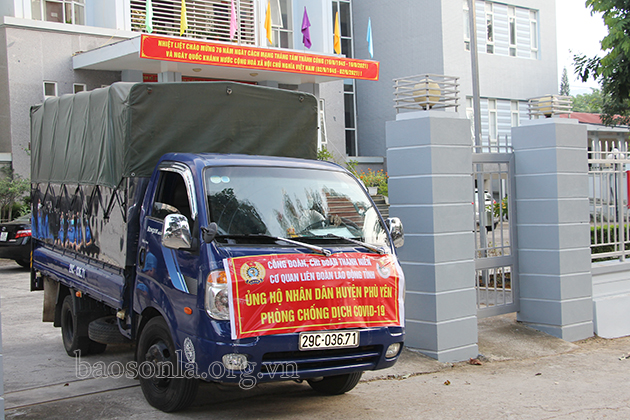 Liên đoàn Lao động tỉnh chuyển hàng hóa ủng hộ công nhân lao động huyện Phù Yên.