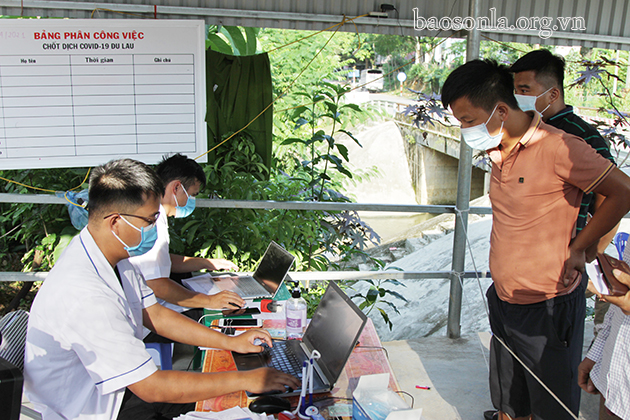 Người dân thực hiện khai báo y tế tại chốt kiểm dịch bản Đu Lau, xã Tân Lang (Phù Yên).