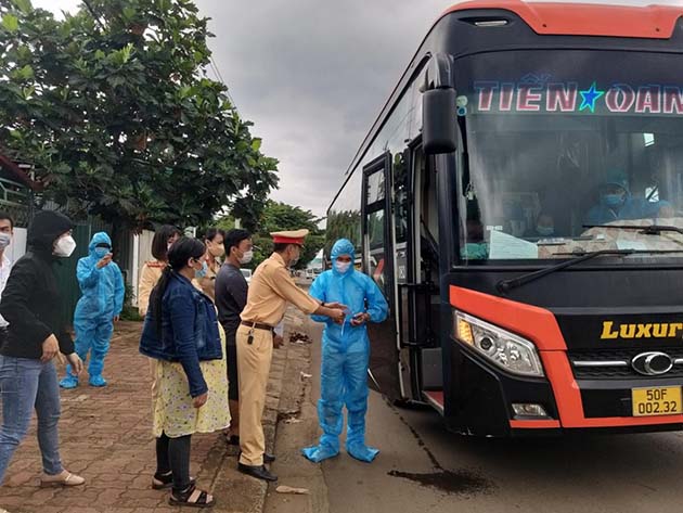 | Lực lượng chức năng đang hỗ trợ giúp chị Sua lên xe theo đoàn hỗ trợ công dân của tỉnh Đắk Lắk đi Gia Lai |