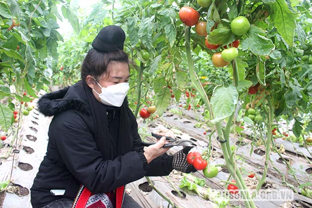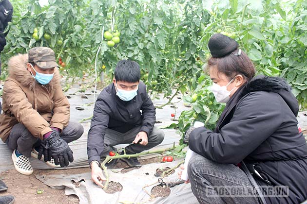 Mô hình trồng cà chua Beef trong nhà màng tại HTX Đại Phát, bản Nhạp, xã Cò Nòi, huyện Mai Sơn.