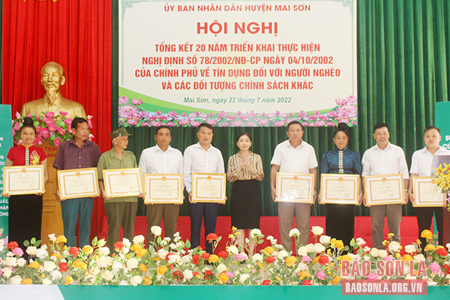 Nhân dịp này, Ngân hàng CSXH Việt Nam đã tặng giấy khen 3 tập thể, 9 cá nhân; UBND huyện Mai Sơn tặng giấy khen 5 tập thể, 20 cá nhân có thành tích xuất sắc trong thực hiện tốt chính sách tín dụng đối với người nghèo và các đối tượng chính sách khác giai đoạn 2002-2022.