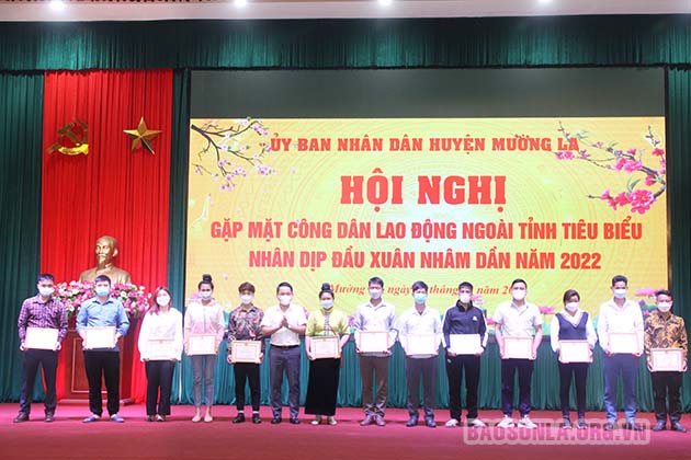 Nhân dịp này, Huyện ủy Mường La tặng quà, mỗi suất trị giá 500.000 đồng cho 90 công dân lao động ngoài tỉnh tiêu biểu; UBND huyện Mường La tặng Giấy khen cho 21 công dân lao động ngoại tỉnh tiêu biểu năm 2021.