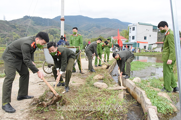 Lực lượng công an huyện giúp nhân dân bản Nà Nong, thị trấn Ít Ong phát quang, nạo vét mương, phai.