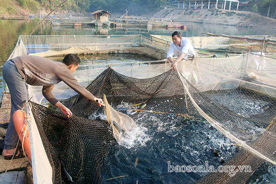 Nông dân xã Mường Trai (Mường La) phát triển nuôi cá lồng trên lòng hồ thủy điện Sơn La.