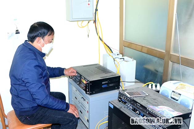 Công chức văn hóa xã hội xã Tông Lạnh, huyện Thuận Châu vận hành hệ thống truyền thanh cơ sở.