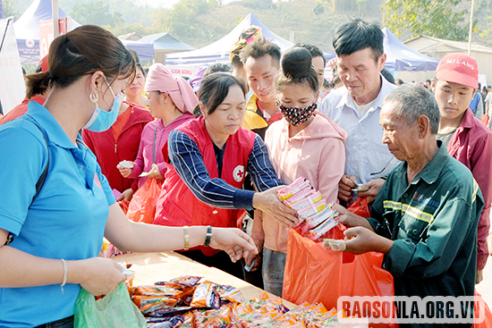 Người dân xã Nậm Ét (Quỳnh Nhai) nhận nhu yếu phẩm của Hội Chữ thập đỏ tỉnh tại Chợ nhân đạo (ảnh chụp trước 27/4).