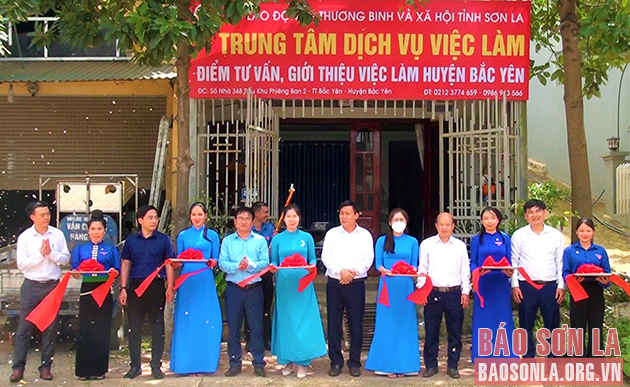 Lãnh đạo huyện Bắc Yên cắt băng khánh thành điểm tư vấn, giới thiệu việc làm tại huyện Bắc Yên.