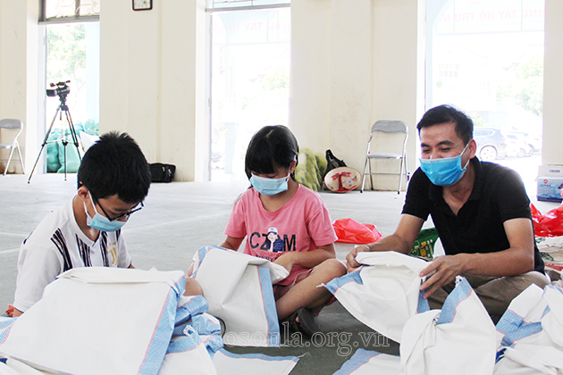 Các đoàn viên nhanh chóng chia gạo thành những suất quà.