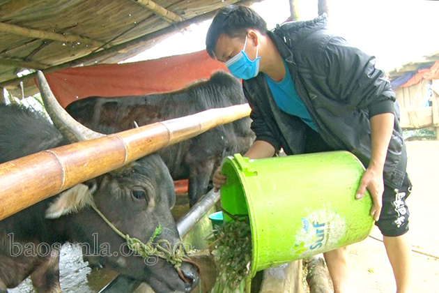 Người dân bản Kim Bon, xã Kim Bon, huyện Phù Yên che chắn chuồng trại, bổ sung thức ăn giàu tinh bột phòng rét cho gia súc.