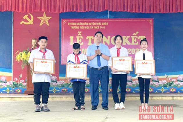 Đại diện Quỹ Tín dụng nhân dân thị trấn Nông trường Mộc Châu trao thưởng học sinh Trường Tiểu học &THCS 16/4.
