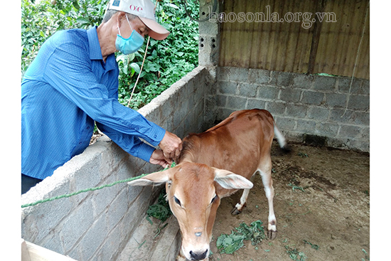 Người dân bản Ái (Chiềng Xôm) tiêm vắc-xin phòng bệnh viêm da nổi cục cho bò.