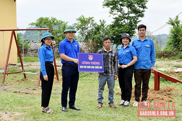 Lãnh đạo huyện Đoàn Mường La bàn giao khu vui chơi cho trẻ em tại điểm trường mầm non bản Phiêng Phả, xã Chiềng Lao.