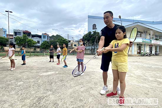 Thầy giáo hướng dẫn bộ môn cầu lông cho học sinh.