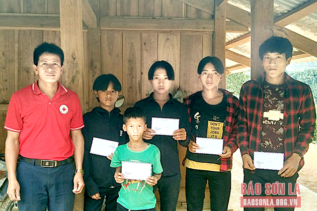 Đại diện xã Nậm Lạnh thăm hỏi tặng quà các cháu bị sét đánh.