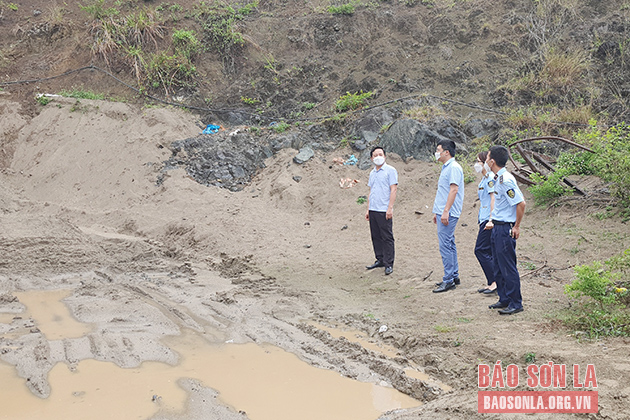 Đoàn kiểm tra liên ngành huyện Quỳnh Nhai kiểm tra điểm tập kết cát trên địa bàn.