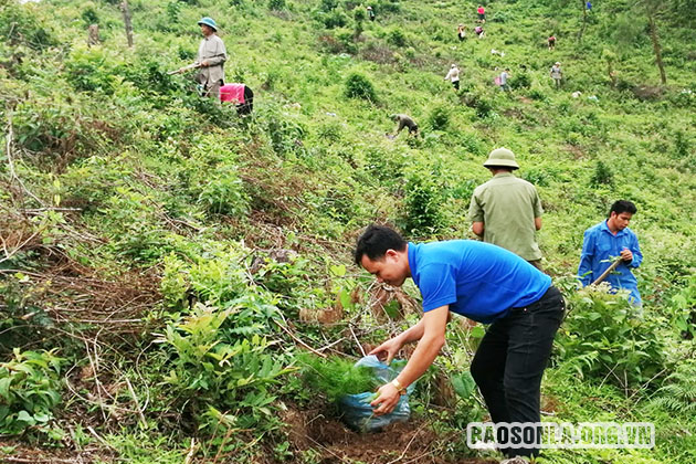 Đoàn viên thanh niên xã Púng Tra trồng cây thông tại bản Pom Thao, xã Púng Tra.