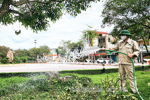 Công nhân Công ty CP Môi trường và Dịch vụ đô thị Sơn La chăm sóc cây cảnh.