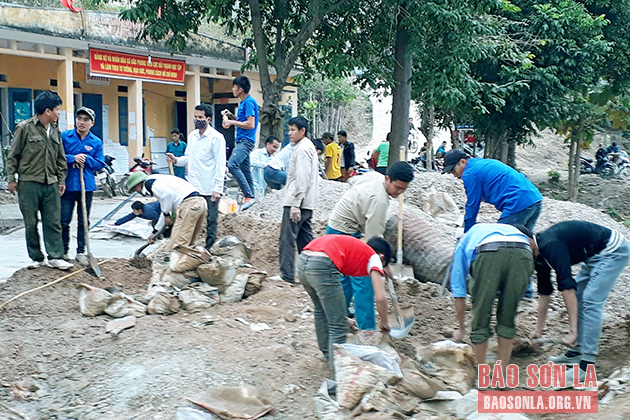 ĐVTN xã Bắc Phong, huyện Phù Yên tham gia đổ bê tông sân Trụ sở UBND xã.