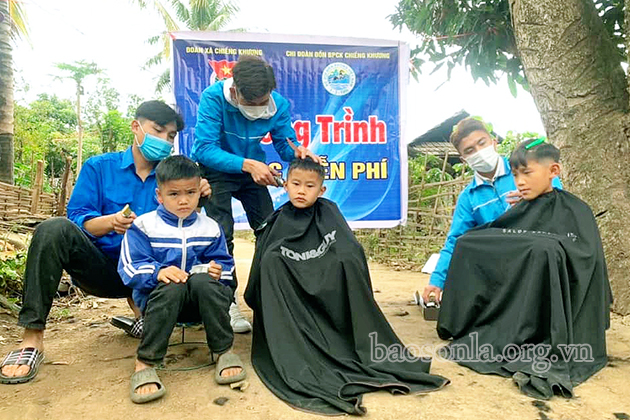Đoàn xã Chiềng Khương phối hợp cùng Chi đoàn Đồn Biên phòng Cửa khẩu Chiềng Khương cắt tóc miễn phí cho các em.