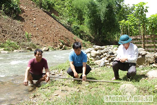 Tổ phòng chống thiên tai bản Suối Tre, xã Tường Phong (Phù Yên) khảo sát điểm cắm biển cảnh báo nước lũ tại suối Tre.