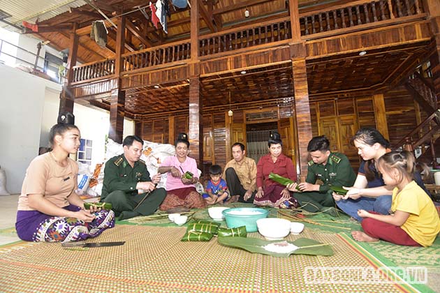 Bộ đội Đồn Biên phòng Mường Lạn gói bánh chưng giúp gia đình ông Vì Văn Pha, người có uy tín của bản Nà Vạc.