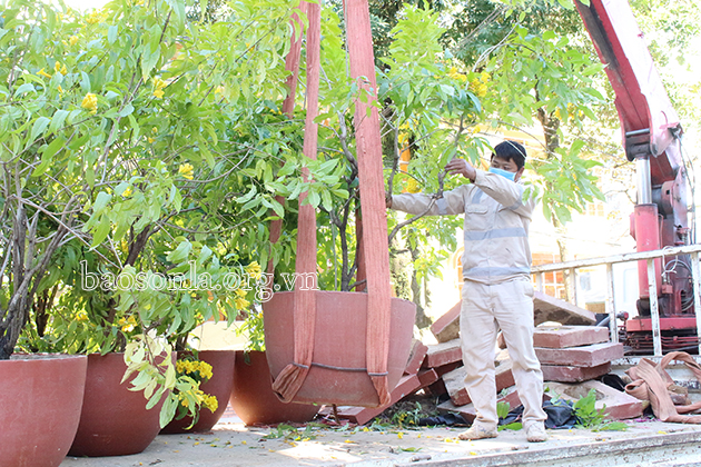 Công nhân Công ty cổ phần Môi trường và Dịch vụ đô thị Sơn La chỉnh trang đô thị trên địa bàn Thành phố.