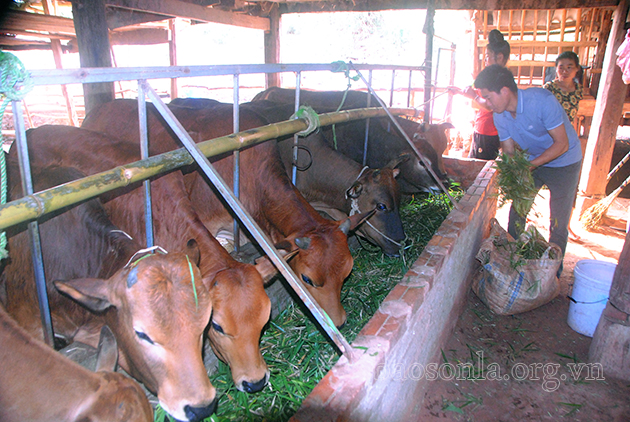 Người dân bản tái định cư Bó Phúc nuôi bò nhốt chuồng.